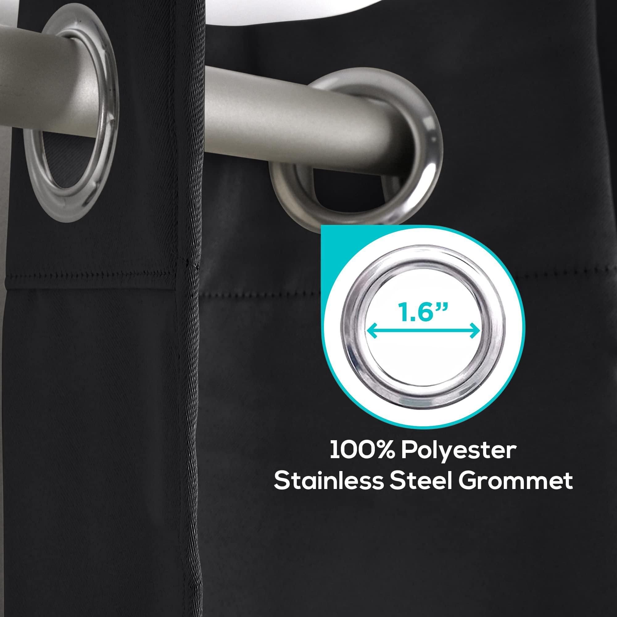 1.what's in the package? a set of 2 black blackout curtain panels, each panel measures 42 inches the width and 84 inches the length. each curtain panel includes 6 silver metal grommet rings, each grommet inner diameter is 1.6 inch, which is compatible with most rods, and easy slides to install.